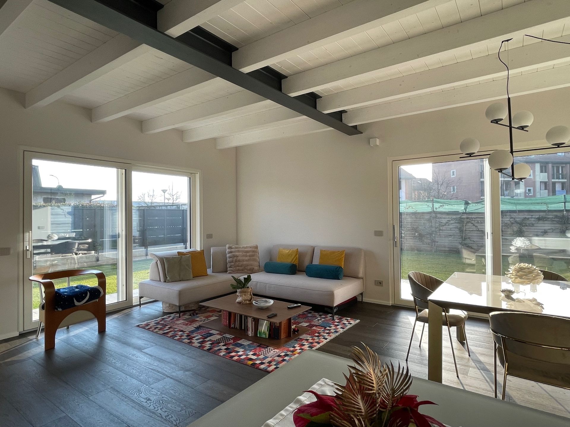 Villa unifamiliare in Bioedilizia realizzata in Provincia di Milano, realizzata con struttura portante a Telaio, disposta su unico livello, dal design moderno, caratterizzata da ampio porticato con solaio piano, le facciate caratterizzate dalle ampie vetrate che rendono luminosissimi gli interni, ampia zona giorno con con tetto sbiancato a vista, zona notte composta da tre camere, studio e doppi servizi, completano l'abitazione il box auto, lavanderia/locale tecnico e la cantina.